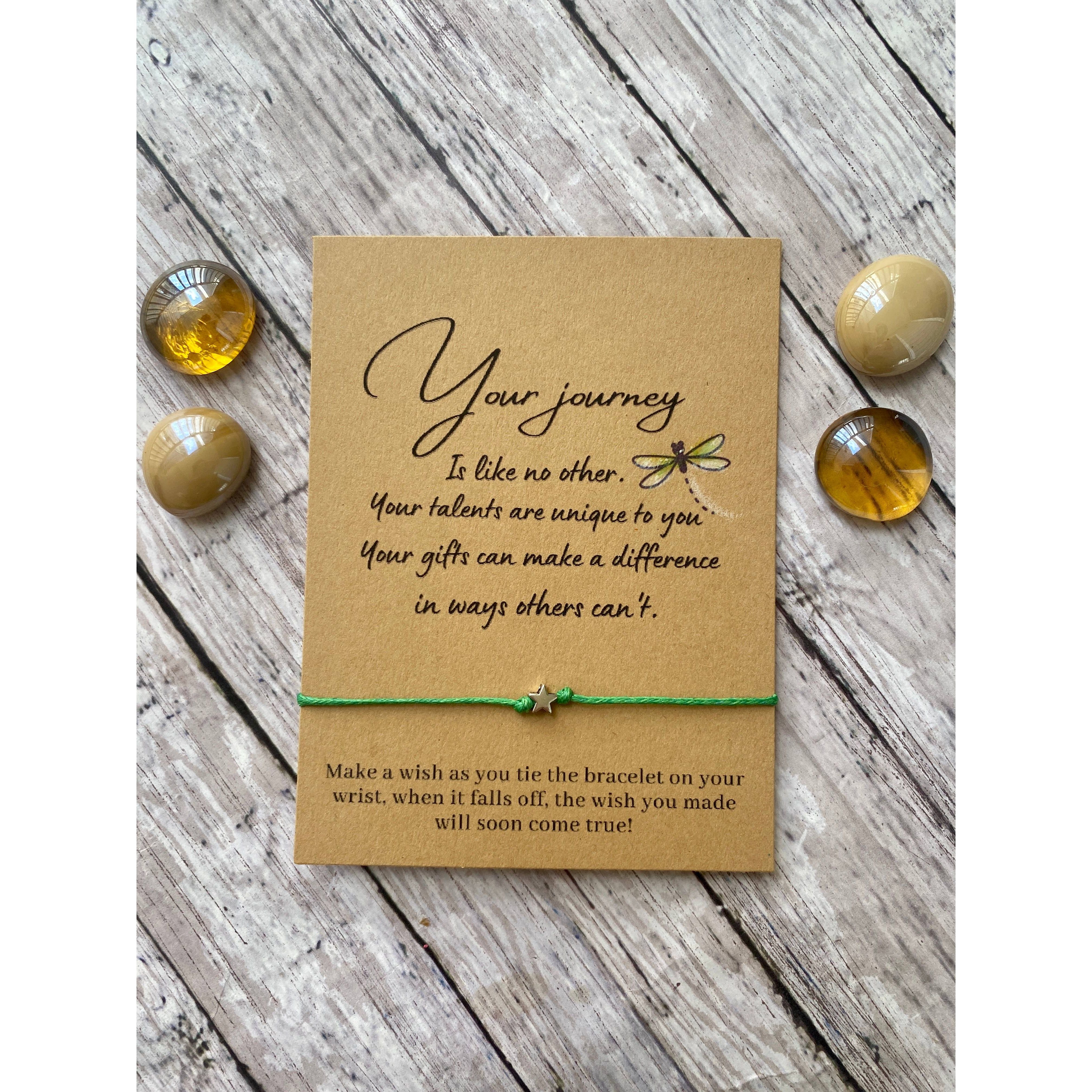 Handmaid wish bracelet with a beautiful massage, perfect for gifting to someone special, includes a 1mm cord bracelet, each with a silver star charm. Massage is printed on a high-quality kraft card and presented in a clear cellophane sleeve, The string bracelet is approximately 12" in length and the card is about 4.5"x3.5".
